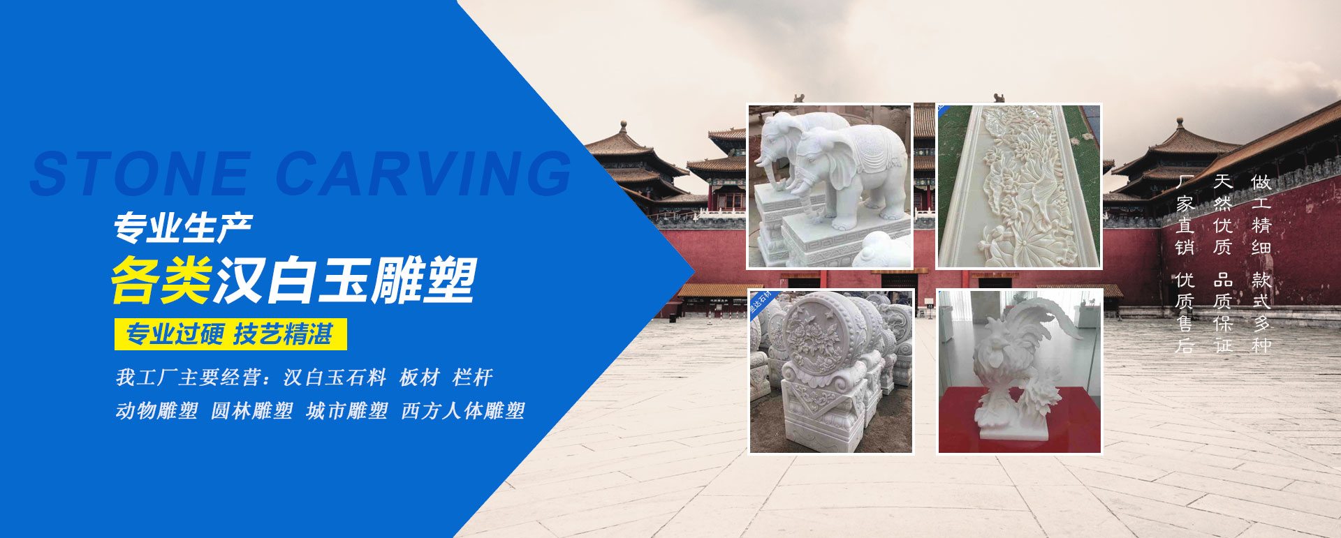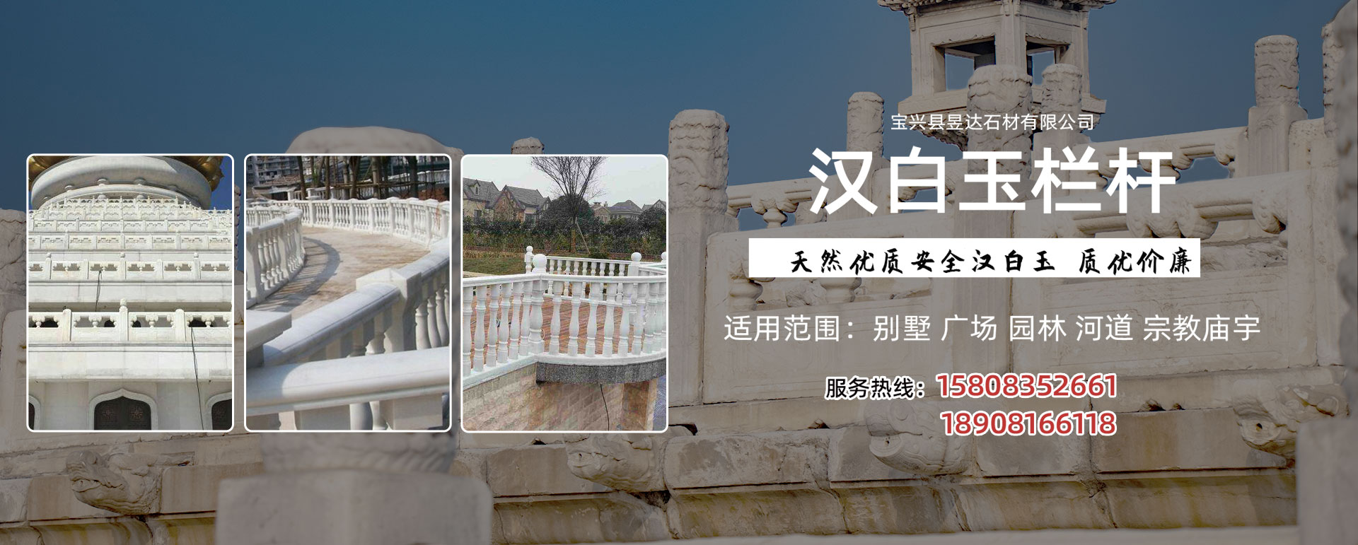 寶興縣昱達(dá)石材有限公司于2016年4月在工商局注冊(cè)成立,坐落于寶興縣靈關(guān)工業(yè)集中區(qū)柏椿樹漢白玉產(chǎn)業(yè)園,廠區(qū)占地面積近30畝。雖然公司成立不久,但是我們已經(jīng)從事石材行業(yè)近二十年的時(shí)間。在工廠發(fā)展壯大的時(shí)間里,我們始終為客戶提供好的產(chǎn)品和技術(shù)支持、健全的售后服務(wù),近年隨著科學(xué)技術(shù)的發(fā)達(dá),我們也引入了機(jī)械設(shè)備。我工廠主要經(jīng)營(yíng):漢白玉石料、漢白玉板材、漢白玉欄桿、漢白玉雕塑(動(dòng)物雕塑、圓林雕塑、城市雕塑、西方人體雕塑)、漢白玉像、漢白玉墓碑、漢白玉石獅、漢白玉花瓶柱;大理石、花崗石荒料購(gòu)銷。